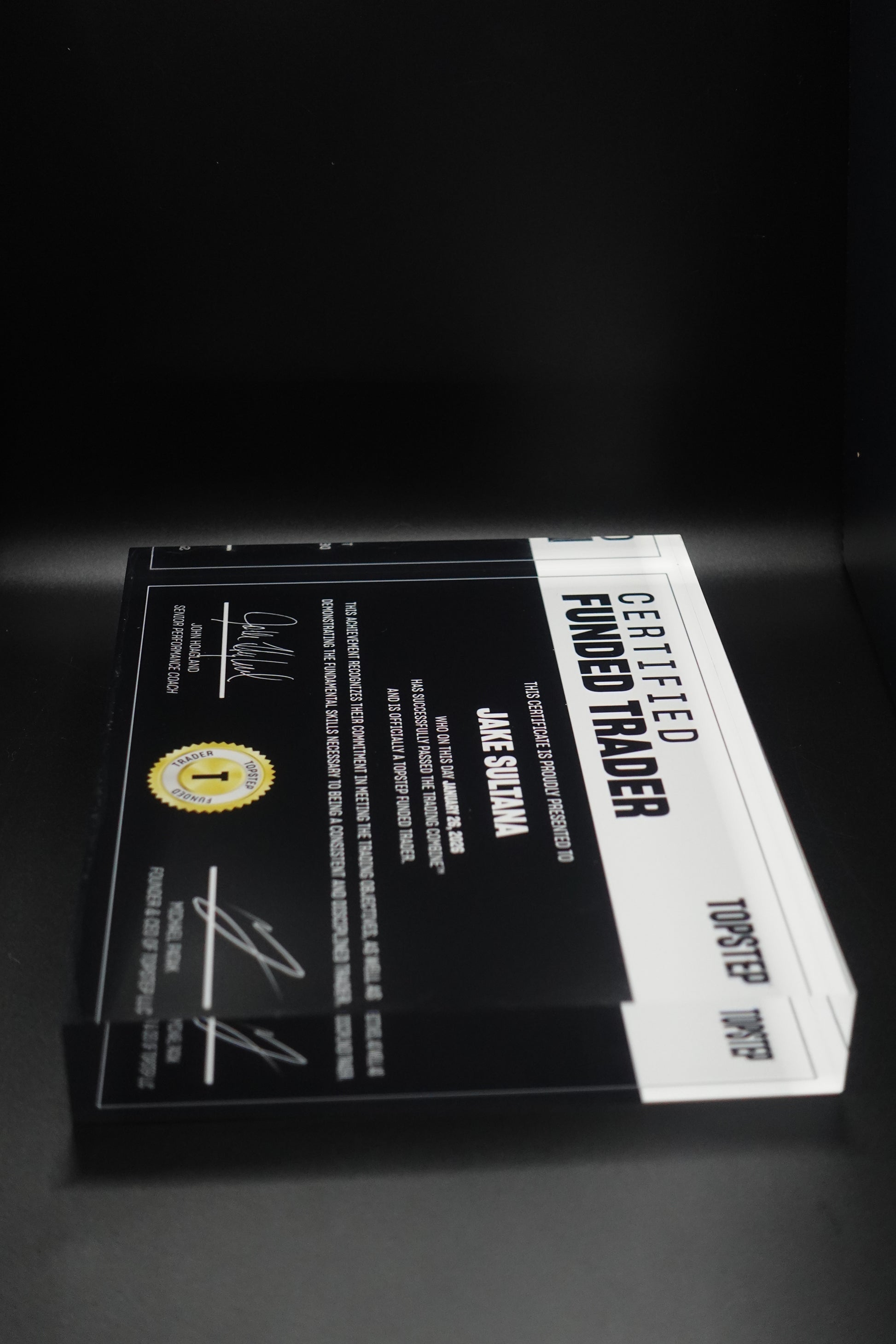At Verified Trader, we believe that every trading success deserves recognition beyond the digital space. We specialize in transforming your trading credentials into beautifully crafted plaques that showcase your achievements with pride and professionalism. Whether it's a funded pass certificate or dashboard proof, we’re here to immortalize your milestones in style.